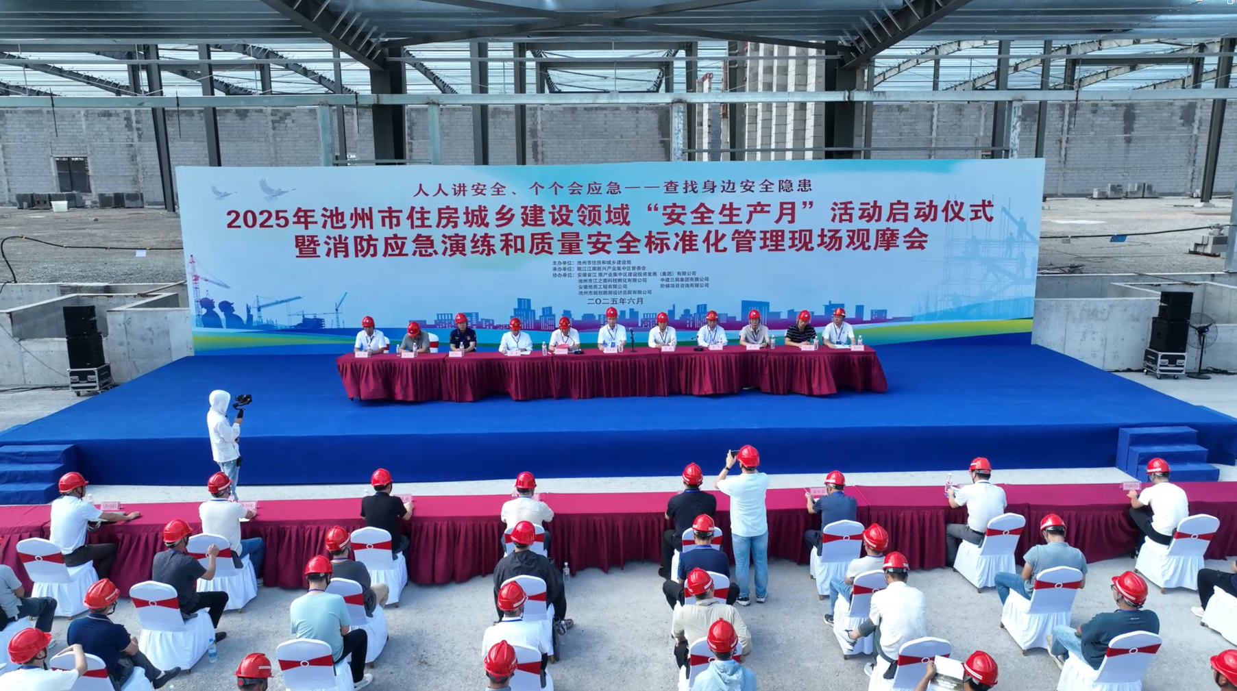 近日,《2025年池州市住房城鄉(xiāng)建設(shè)領(lǐng)域“安全生產(chǎn)月”活動啟動儀式暨消防應(yīng)急演練和質(zhì)量安全標(biāo)準(zhǔn)化管理現(xiàn)場觀摩會》在集團(tuán)所屬地質(zhì)公司承建的“京東云倉EPC項(xiàng)目”現(xiàn)場隆重舉行。副市長胡軍保、集中區(qū)管委會副主任張平、市住建局局長付四九及三縣一區(qū)住建安全部門和企業(yè)代表共同參與此次活動。