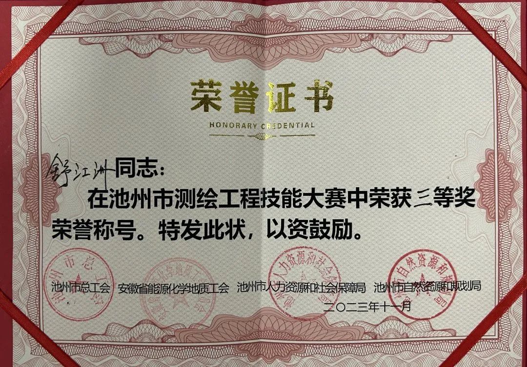 大賽設(shè)置了理論知識(shí)測(cè)試、團(tuán)體技能操作和個(gè)人技能操作三個(gè)環(huán)節(jié)。設(shè)計(jì)總院5名職工參賽,參賽選手們先后完成了GNSS-RTK施工放樣、1:500數(shù)字地形圖測(cè)繪、四等水準(zhǔn)測(cè)量、測(cè)繪理論知識(shí)等多個(gè)項(xiàng)目,積極將所學(xué)理論知識(shí)轉(zhuǎn)化為實(shí)操技能,展現(xiàn)了良好的競(jìng)技風(fēng)貌。經(jīng)過(guò)激烈地角逐,池州市規(guī)劃勘測(cè)設(shè)計(jì)總院有限公司榮獲團(tuán)體一等獎(jiǎng),所屬測(cè)繪分院職工姜加喜和舒江洲兩位同志分別獲得個(gè)人賽一等獎(jiǎng)和三等獎(jiǎng)。