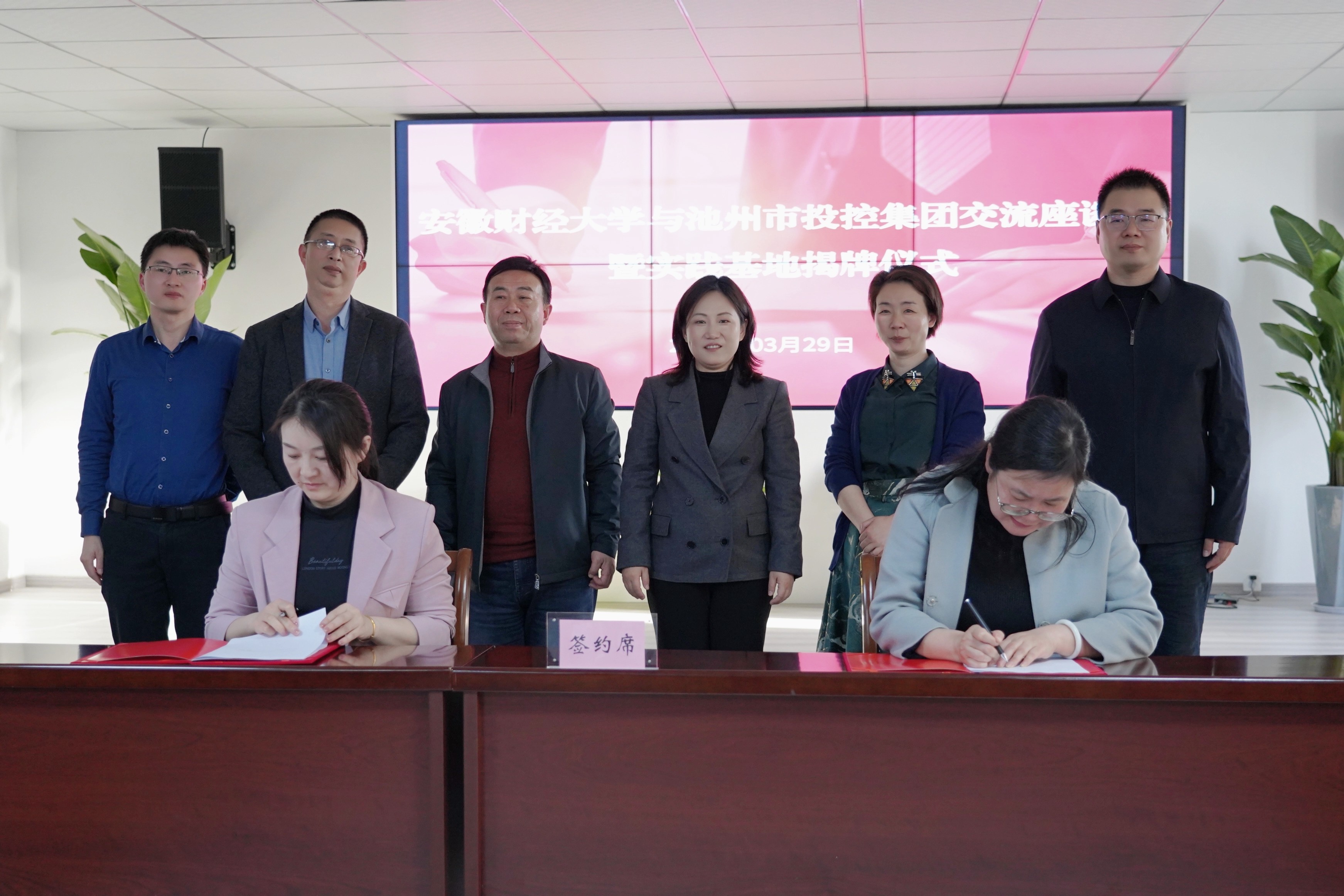 3月29日下午,安徽財經大學與池州市投資控股集團舉行“就業(yè)創(chuàng)業(yè)實踐基地”簽約暨揭牌儀式。安財校黨委常委、副校長趙曉明,校學生處副處長丁龍華,校團委副書記袁寶剛,校團委兼職副書記董松濤,池州市人社局黨組成員、市人事考試指導中心主任章和平,市就業(yè)創(chuàng)業(yè)服務中心主任紀平,就業(yè)促進科科長孟華等有關領導參加活動。儀式由黨委副書記、工會主席嚴艷主持。