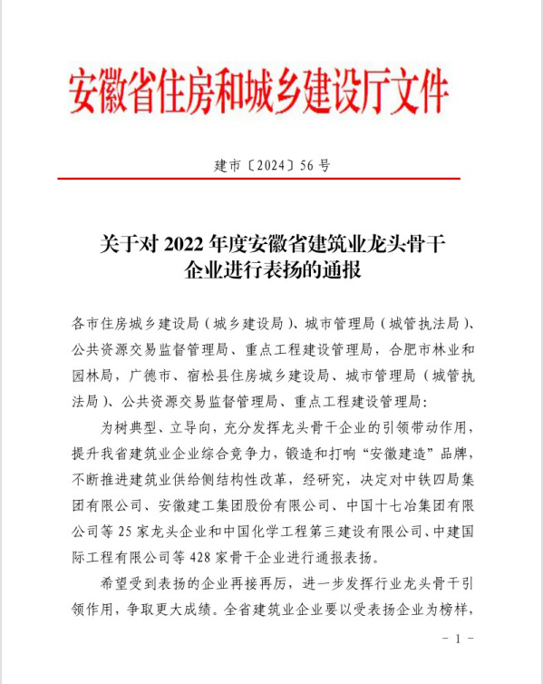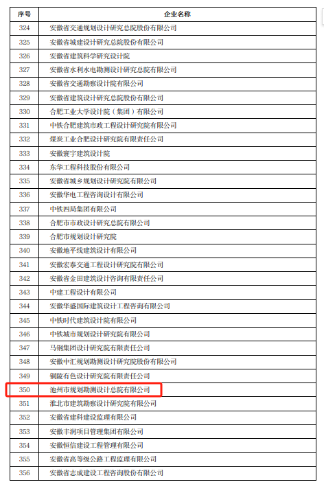 4月10日,安徽省住房和城鄉(xiāng)建設廳發(fā)布了《關于對2022年度安徽省建筑業(yè)龍頭骨干企業(yè)進行表揚的通報》,集團所屬池州市規(guī)劃勘測設計總院有限公司榮登榜單。